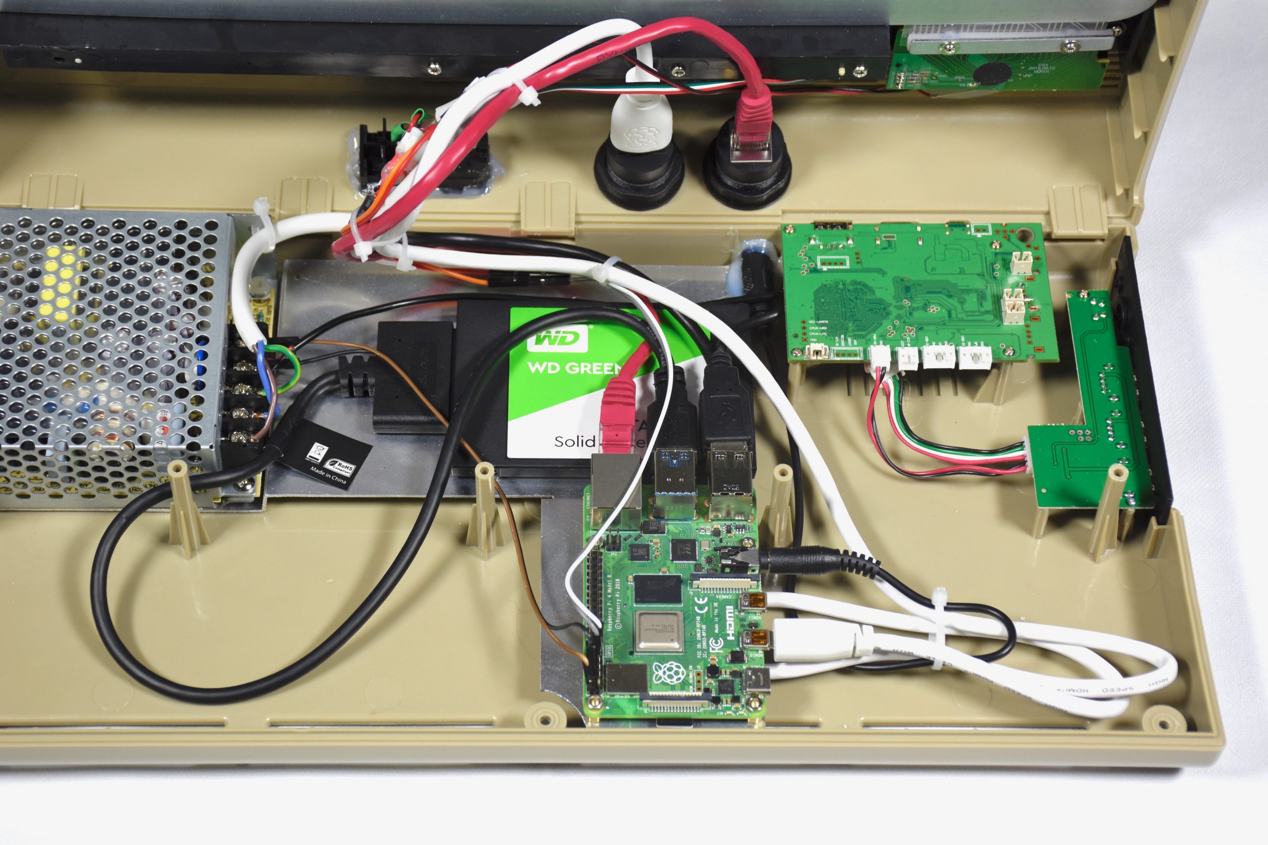 I integrated a Raspberry Pi 4 into a Commodore C64 Maxi case. The Pi uses the integrated keyboard and the USB hub. An integrated power supply provides power to both, the Pi and the C64, which now run in parallel. The Raspberry Pi boots from an internal SSD drive, turning this machine into a full desktop computer that can also run Retro Pi for true retro gaming.