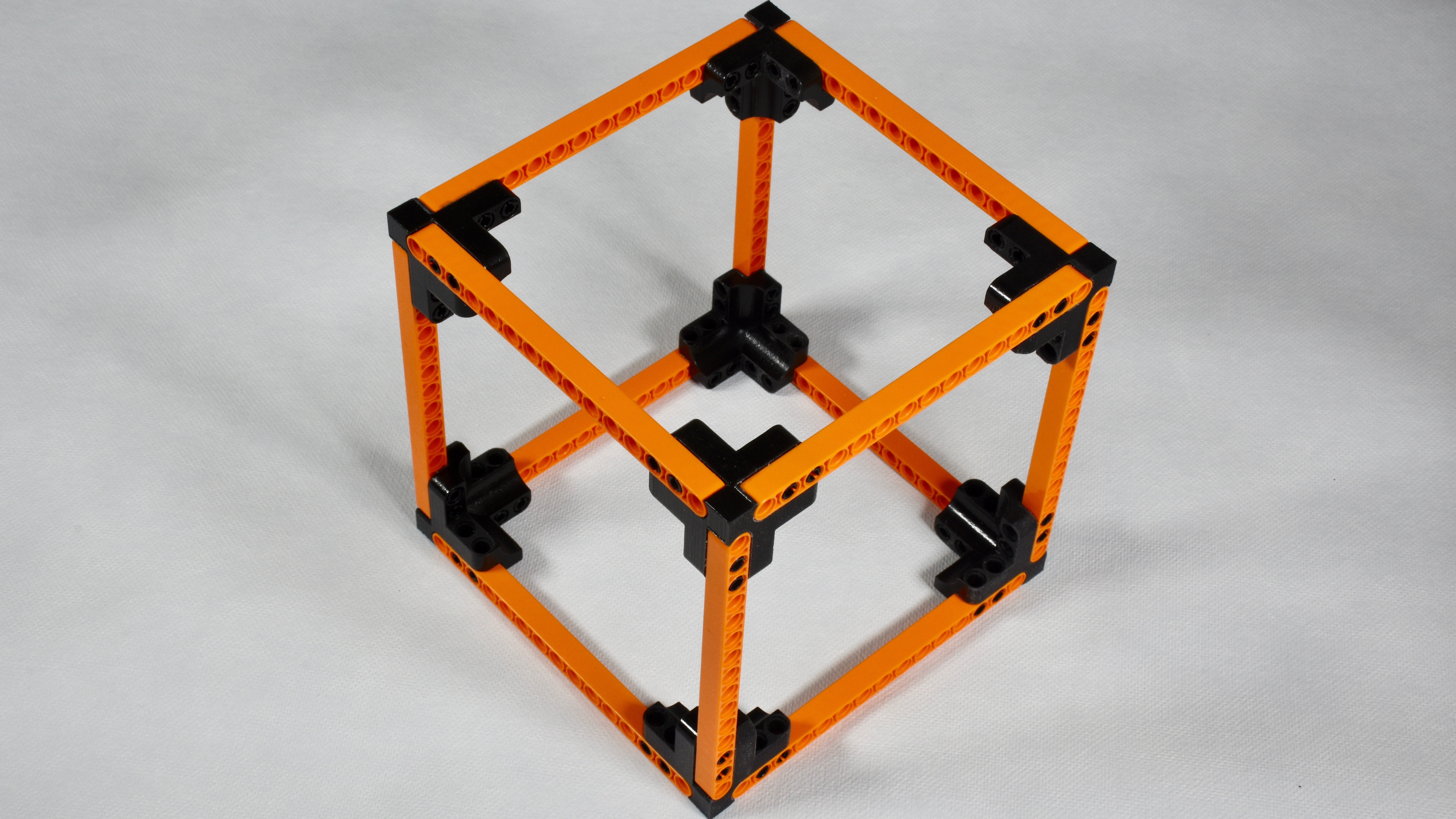 My second design had no pins but still the option to firmly hold a technic beam. With this new 3D printed corner part it is possible to build a perfectly stable cube with a minimum of parts. The additional holes provide options for further strengthening the cube or to connect other parts to the cube.